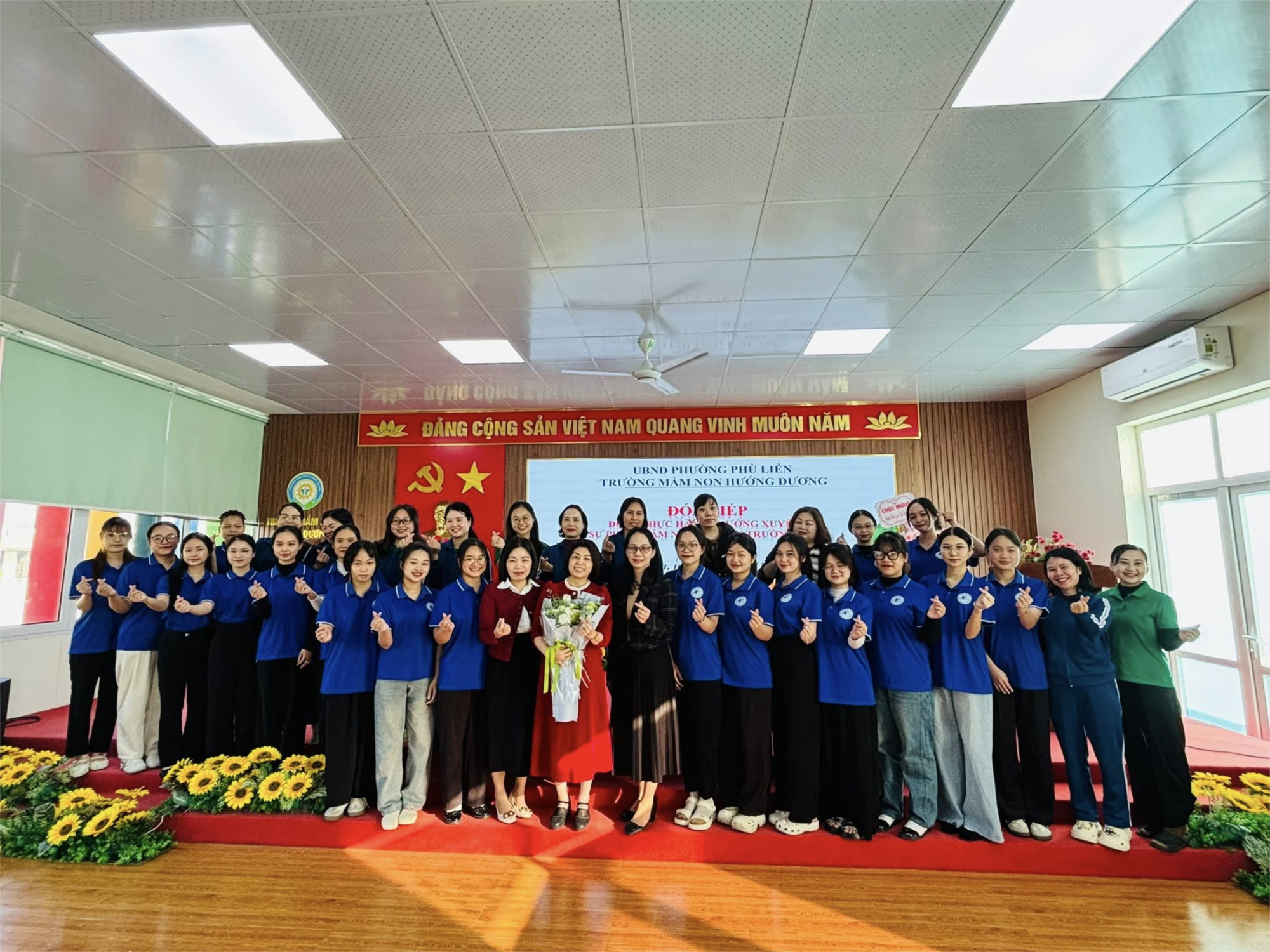 Thực hiện Kế hoạch số 7159/KH-SGDĐT ngày 26/9/2025 của Sở Giáo dục và Đào tạo Hải Phòng về thực hành, thực tập sư phạm năm học 2025 - 2026 đối với sinh viên các ngành đào tạo giáo viên mầm non, phổ thông thuộc Trường Đại học Hải Phòng; Quyết định số 765/QĐ-UBND ngày 7/10/2025 của UBND phường Phù Liễn về thành lập Ban Chỉ đạo thực hành, thực tập sư phạm năm học 2025-2026 trên địa bàn phường Phù Liễn, Sáng ngày 24/11, trường mầm non Hướng Dương chính thức tổ chức Đón tiếp các em Sinh viên Đoàn thực hành Thường xuyên 1–ĐH Giáo dục mầm non K25 Trường Đại học Hải Phòng. Tại Hội nghị, BGH trường MN Hướng Dương đã phổ biến tình hình nhà trường, nội quy quy định khi Sinh viên tham gia thực hành thường xuyên, phân công các em sinh viên vào các lớp nhà trẻ và mẫu giáo. Đại diện Đoàn sinh viên đã lên phát biểu và tặng hoa cảm ơn nhà trường.